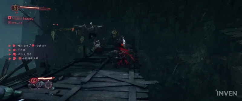 또 다른 활용처는 적의 공격을 카운터할 때다. 카운터라고 하니 패링을 생각할 수도 있지만, 좀 다르다. 싸우다 보면 적이 붉은 안광을 띠며 특수 패턴을 쓸 때가 있는데, 이때 마귀 자세로 공격하면 가드를 부수는 것과 마찬가지로 적의 패턴을 끊어내는 동시에 흐름을 역으로 가져올 수 있다. 패링과는 또 다른, 보다 공격적인 형태의 카운터라 할 만하다.