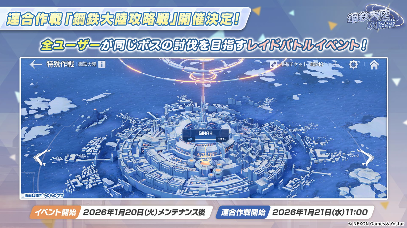 이번 업데이트를 통해 신규 콘텐츠 연합 특수 작전 ‘강철대륙 공략전’도 추가되었다. 해당 콘텐츠는 모든 유저들이 동일한 보스 토벌을 목표로 하는 레이드 배틀 이벤트로, '비나', '호크마', '테페레트' 등 총 8명의 데카그라마톤 보스가 등장한다. 또한 지난 4.5주년 기념 업데이트 당시 처음 도입된 ‘시논의 배틀패스’를 만나 볼 수 있다.